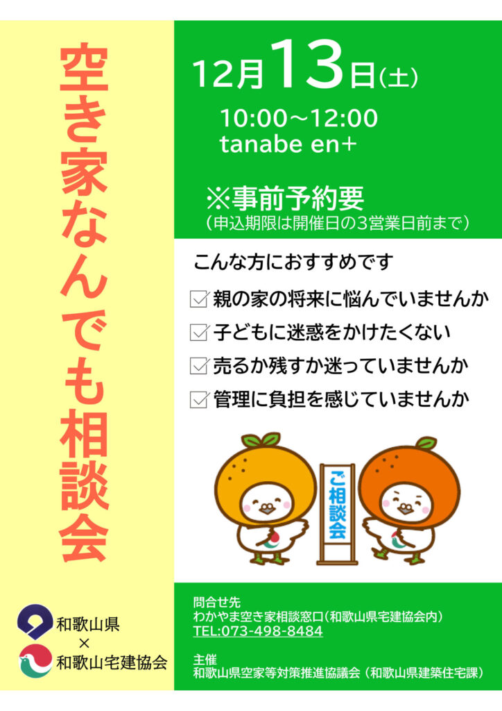 - わかやま空き家相談窓口(和歌山県宅建協会内) TEL:073-498-8484【受付時間】平日10:00~12:00/13:00~16:00